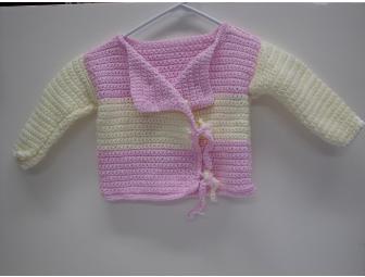 This is a cute, hand-crocheted pink and cream colored infant sweater. It is sized for a 12 month old and has a pink a cream stripped body with cream colored arms. It also has two ties in the front to make it easier to keep on. The colors will remind you of strawberries and cream and you will just want to gobble your child up.