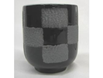 Elegant black and silver tea cup features a checkered print.
