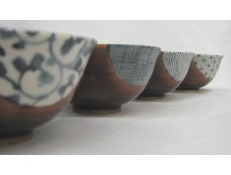 As you pick up the grains of rice with your chopsticks (or fork) with one hand, your other hand holds the porcelain bowl, almost mindlessly caressing its gentle curvature. Each bowl has its own personality, yet blend together…like family. See the artistic brush strokes in the rich amber portions of the bowls and admire the individual indigo patterns of each one. Rice (or other foods) will never taste as good as when eaten from these works of art.