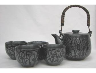 A dark, swirling arabesque pattern adorns this iron teapot, with a four cups of the same pattern.