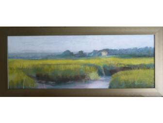 This 9" x 24" custom framed pastel painting captures the tidal marsh on Gray's Beach in Yarmouth Port on Cape Cod. The moody palette is reflective of the light overcast sky.