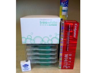 Tres White at home whitening kit, floss, toothbrush, & Cologate Optic Whitepaste.