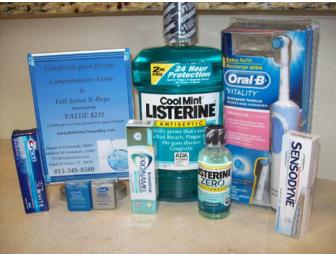 Comprehensive exam, full series x-rays, Oral B Vitality toothbrush, 3 travel size toothpastes, 1 travel size listerine, 2 floss, and 1.5 liter Coolmint Listerine