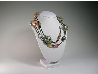 Blown glass, wire, paper, fabric, semi precious stones. 44long