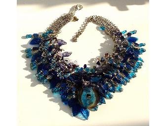 Agate Druzy pendent representing a flower bloom, surrounded by over 300 iridescent glass beads. Blue and purple glass flowers, leaves and berries. 16l x 3.5w x 1.5d
