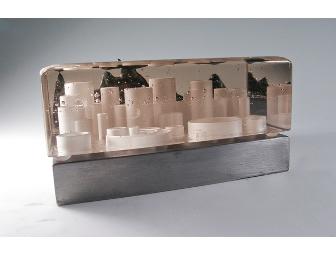 Fused glass, ground, polished, drilled. Welded metal shelf. 3h x 6w x 5d Signed, 2011
