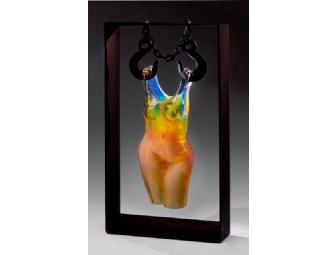 Hand blown glass sculpted free-hand while the glass is hot. Steel Frame, found industrial hooks. 32h x 16w x 5d Signed, 2012