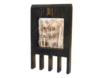 Fused glass, carved wood 14.5h x 9w x 1.5d Signed, 2012