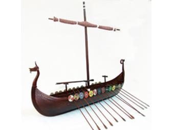 This is a wonderful replica of a Viking ship, hand-crafted with great detail. Check out the sheilds and oars. You can imagine it flying over the Atlantic under full sail. Wood, fabric and plastic construction. 24" long by 12" deep by 20" high.