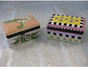 Two Limoges-style porcelain trinket boxes featuring hand-stitched needlepoint lids. Each box measures 3" x 2 3/4" x 2 3/4.