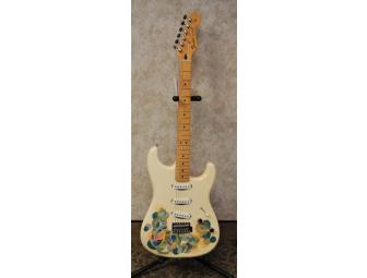Incredibly painted Fender guitar. Pixar artist Scott Morse sketched and painted Toy Story superhero, Buzz Lightyear, onto this Fender Stratocaster. Included with the guitar will be an original framed pencil sketch of Buzz Lightyear by Scott Morse. This guitar was painted with acrylic paint and clear-coated to create a one-of-a-kind, playable piece of music/art memorabilia.