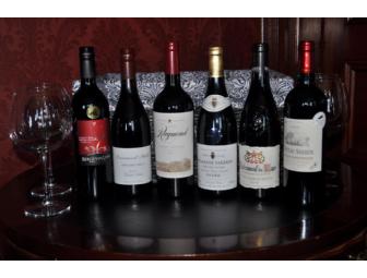 Basket of six bottles of Premier French, US, and Australian Red Wines including wine glasses, cocktail napkins, and bottle stoppers. Cheers!