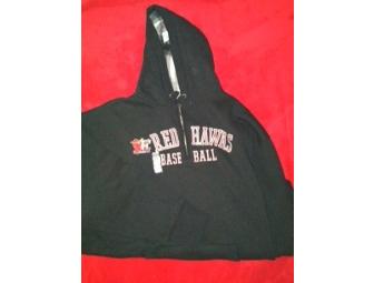 You'll stay warm at all the games with this cozy black hooded half-zip sweatshirt. It has "RedHawks Baseball" screenprinted in red and white on the front. It is an Adult XXL.