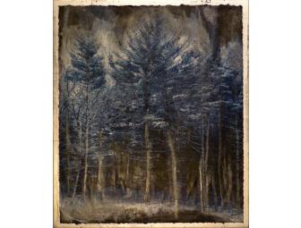 Winter Blues, was created from a low light digital photograph of snow covered pines. The image was manipulated to highlight the blues then (inkjet pigment) printed & painted repeatedly, slowly building up layers of pigment on black printmaking paper. The completed print was mounted to a (silver leafed) board and painted with encaustic to protect the print and add texture.