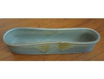 Another unusual hand made ceramic donated by Faith Magoun. Use it in the office to hold desk items, in the dressing room to hold the bottles on your vanity table or in the kitchen to hold a row of spice jars.