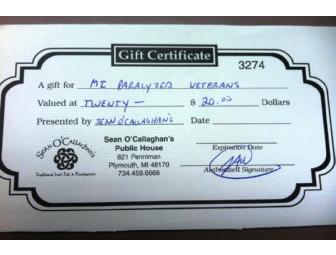 Come by and enjoy Sean O'Callaghan's Irish Pub & Restaurant's house made Irish dishes, such as, Shepherd’s Pie, Irish Stew, Corned Beef & Cabbage, and of course our hand battered Fish n’ Chips by bidding on this $20.00 gift certificate. O'Callaghan's has a wide variety of other choices, including, Crispy Calamari, Spicy Beef Tenderloin Tips, Seared Salmon, and our one-of-a-kind “Mark-It Salad”. O'Callaghan's goal is to Exceed Everyone’s Expectations with great food, great drinks, and our fun and friendly staff.