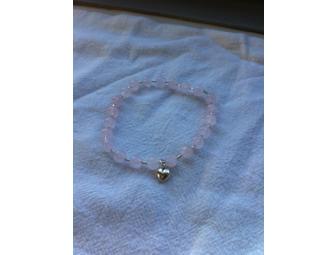 Semiprecious pink rose quartz beads symbolizing friendship are spaced with small sterling silver tubes and charmed with a tiny sterling silver puff heart all on stretch cord to fit with ease. (7")