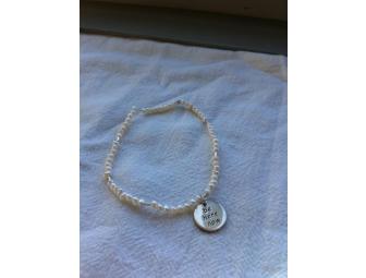 Tiny white freshwater pearls spaced with tiny sterling silver tubes stretch around your wrist with a simple sterling silver charm bearing three small words to remind you of the most elemental lesson of every moment: Be Here Now. (7" on stretch cord)