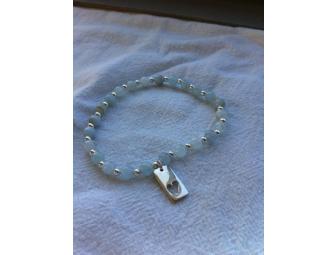 Wear your heart on your sleeve with this semiprecious pale blue aquamarine and sterling silver beaded bracelet with a streling silver heart "tag" charm that dangles around your sleeve. (7" on stretch cord)