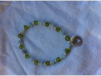 Semiprecious beads of pale blue aquamarine, calming green peridot and sterling silver are embellished with a sterling silver heart cutout charm and strung on stretch cord to give you a "group hug" each wearing. (7")
