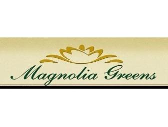 This outstanding,27-hole, public golf facility opened for play in 1998. Recognized as one of the top public golf facilities in the southeast, Magnolia Greens centers around The Championship Course. It has been the venue for several PGA Tour qualifying events. The Azalea Course, a full scale, nine-hole course, is great for all golfers, from the avid player who is on the course three or four times a week, to the beginner, excited about this great new game he's found. The practice facilities are unmatched in the area. And, add to all that, The Magnolia Grill and JJ's, the patio bar, and this outstanding, public golf package is complete. If you are looking for great public golf in the Wilmington/Brunswick County area, you will find it at Magnolia Greens Golf Course. Included is one tee time for four golfers to play one round of 18 holes. Includes golf cars. Certificate expires December 31, 2012.