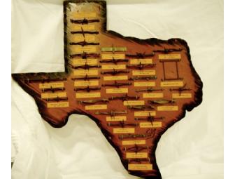 Mounted selection of 31 samples of barbed wire used in Texas.