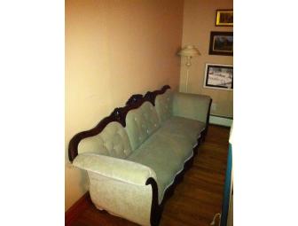 Beautiful Victorian couch, about 84” long and 32” deep.  The upholstery is completely new in an historically-correct, pale sage green velvet with matching buttons.  The dark wood appears to be American black walnut, featuring beautiful, original floral carvings in perfect condition.