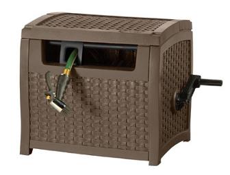 Fully assembled java brown garden hose reel. 21"W x 17"D x 19"H and holds up to 175ft. of 5/8" garden hose. Contemporary wicker style and durable resin construction. Conceals hose and reel.