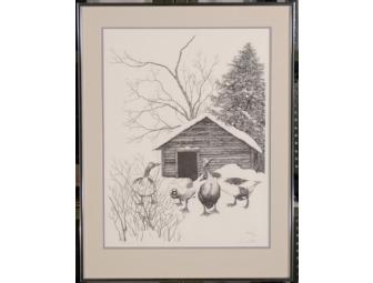 Farm Geese - Print #392 of 400. This print of intense, inquisitive geese is from the 1980s and is sold out. It illustrates Matras' emphasis on clarity and stark contrast of black and white. It is an offset lithographic print of a pen and ink drawing. Size is 26.25" by 20.25".