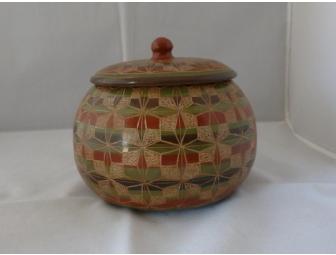 Pottery with indigenous designs. Made in the potters' village of San Juan de Oriente. Signed by the potter. Measures 5" at widest point and 4.5" tall.