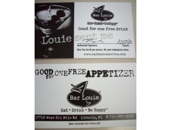 Have some fun and enjoy an appetizer and a drink at Bar Louie of Livonia by placing your bid on this 5 for 5 free drink and appetizer cards. The cards can be used as follows: