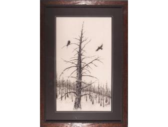 "I originally planned to do a mixed media piece, but when I picked up the first piece of charcoal, I felt the power of the wildfires so strongly that I felt that the piece should be nothing but wildfire charcoal. So I set aside the other materials and concentrated solely on selecting various pieces of charcoal to bring out textures; from bark to raven's wings. From that point on, the image flowed onto the paper. I'm honored and happy to be involved with such a great concept and effort to help restore some of what was lost in the fires."