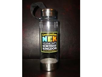 Show your support for the Northeast Kingdom Geotourism Program with Sport Water Bottles featuring the Northeast Kingdom Geotourism Logo.   These sleek, clear, 23 ounce bottles have a stainless steel lid with a black, nylon handle and feature the 9 colors of our unique logo.   Perfect for a day on the trails,  a venture to the peak of the mountain or a paddle across a favorite
