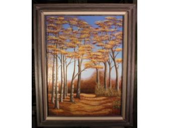 Framed in rough gray wood with linen. This oil on canvas depicts a bright Autumn gold landscape that invites you in for a relaxing and peaceful walk. The viewer can almost hear the quietness.