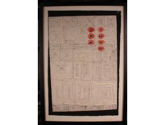 Seven Sisters is a mixed media work on amate bark paper which combines intuitively drawn lines inspired by sound vibration patterns with collaged elements. Seven lipstick stains transformed into eyes creates a surreal image alluding to the Pleiades star cluster.