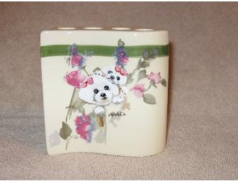 Ceramic toothbrush holder with two hand painted Bichons on the front. Initialed by artist Manuela Quick.