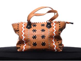 You’ll love this tan cotton-based Faux Leather shopper! It’s weave and stitching pattern is multi colored with weaved trim. Features include: