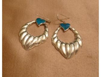 Beautiful scalloped sterling silver earrings with blue turquoise-like heart-shaped stone.