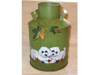 This is a lovely holder made of metal. It has leaves at the top and hand painted Bichons on the front with fall leaves below them. Painted by artist, Paula Holoman.