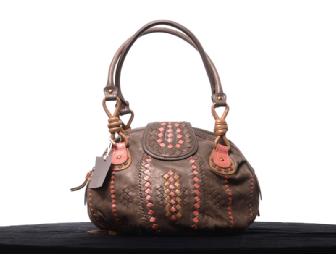 This new Isabella Fiore handbag is made of sumptuous stone-colored leather with coral & light gold toned leather strands woven here and there. It has 2 leather straps and a zipper closure