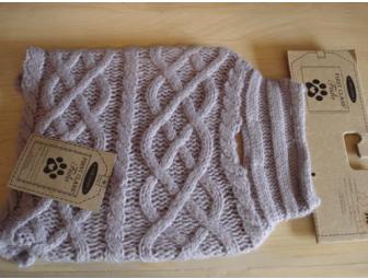 Cozy dog sweater in a dusty lilac colour. Lots of pretty cables and a ribbed neck area for warmth. There is a small hole for the leash to attach. Ribbed sleeves for the front paws. Made by "First class Fido". Prettier shade than shown in the photo. Size is XS to fit back length 8 - 10 inches.