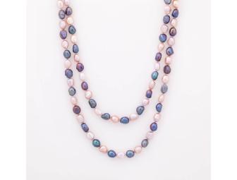 Fresh Water cultured baroque shape pearl necklace with black and pink hues, individually knotted. The necklace is 64" long and each pearl is approximately 10 to 12mm in size. This can be wrapped around your neck two to three times, so use your imagination to change the look each time you wear them!