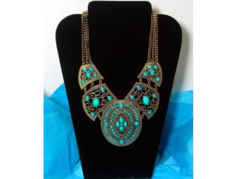 A beautiful turquoise bib necklace giving off an ancient Egyptian feel. Necklace has a toggle clasp.