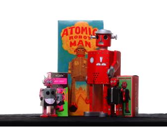 "Atomic Robot Man" is a rare classic and one of the very first tin toy robots. He is a nice reproduction of the famous Japanese Robot of the 1940's with his original color box graphics. It is Wind-up, with the key included, and stands about 12" tall.