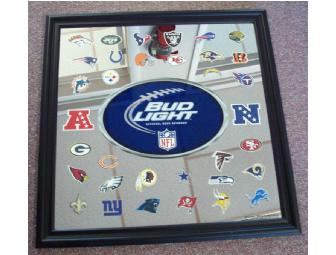 Are you a Bud Light fan? Are you a NFL fan? Then place your bid on this 29 1/4 "x 29 1/4" framed mirror that includes all of the NFL team logos!