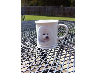 What could be better than having your morning coffe from this precious Bichon coffee mug? One side features the Bichon face and the other has the breed "Bichon Frise". Nice sturdy weight ceramic mug.