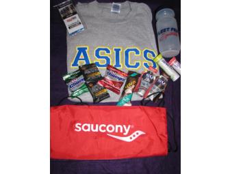 Treat your runner! Package includes an Asics t-shirt (large), a Fleet Feet water bottle, assorted treats from Gu, Jelly Belly sport, and Luna to keep your runner energized and a red Saucony draw string bag to keep it all together!