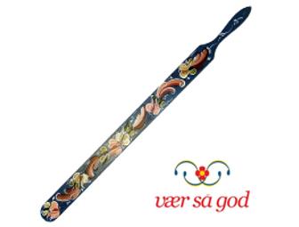 Nothing says Norway like a lefse stick. This beautifully Telemark rosemaled decorative stick by Helga Kennedy can be yours for the right bid. It measures 23" long by 1 3/4" wide with a hole at top perfect for hanging in your kitchen. Colors are rust, sage and white on a Norwegian blue background.