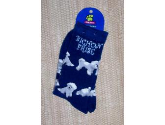 Brand new pair of high navy blue ladies socks with a all-over print of Bichons. Size medium(women's 6-11). Machine washable, blend of acrylic/polyester/spandex.