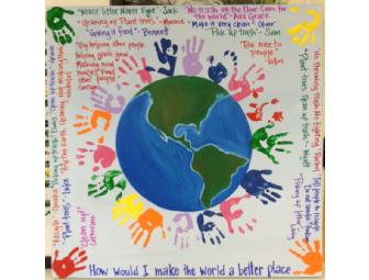 Each student draws a self-portrait circling a painted picture of the earth. They wrote answers to questions about the world.